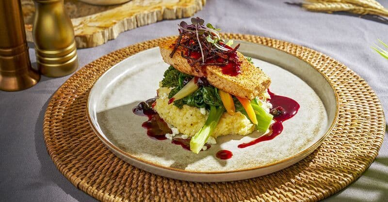 Grilled salmon glazed with house-made blueberry maple reduction, served atop sautéed spinach and broccolini over creamy goat cheese stone-ground grits. Garnished with crispy pulled onions and microgreens.