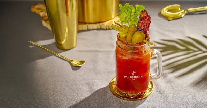 All Bloody Marys are made with Tito’s Handmade Vodka, celery salt, candied bacon, and a pickle skewer