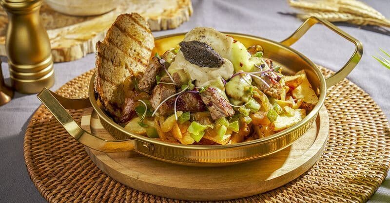Grilled beef striploin, caramelized onion, green pepper, topped with cheddar-jack cheese. Served over country home fries, scrambled eggs, drizzled with porcini & truffle aioli, a side of hollandaise sauce & artisan toast.